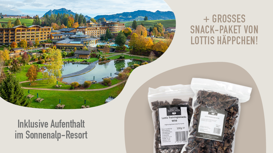 Wir verlosen einen exklusiven Aufenthalt für Dich, eine Begleitperson und Deinen Vierbeiner beim Vier-Pfoten-Camp vom 26. bis 30. April 2026 mit Hundetrainer Ullrich Horn – inklusive Hotelaufenthalt im renommierten Sonnenalp Resort im Wert von über 5.000 Euro sowie einem großen Snack-Paket fürs Training von Lottis Häppchen.