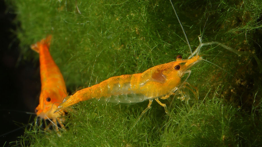 Orange-Fire-Garnelen sind lebhafte, zugleich aber entspannte Aquarienbewohner, die sich gerne in Gruppen aufhalten und fortwährend auf der Suche nach Nahrung sind.